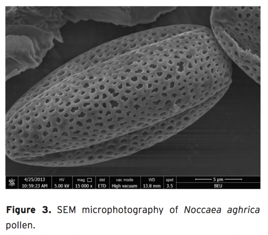 The material of this study is Noccaea aghrica Fırat & Özüdoğru, an endangered, endemic species, only known from three localities in eastern Turkey. The pollen grains of N. aghrica are usually prolate, isopolar, trizono- colpate, reticulate, and with the colpi almost running the full length and terminating at the poles. The average length and width of the pollens are 16.89 μm, 6.21 μm and for polar and equatorial axes are 20.94 μm and 18.89 μm, respectively. The pollen measurements and scanning electron microscope, light microscope photographs were given in the manuscript.