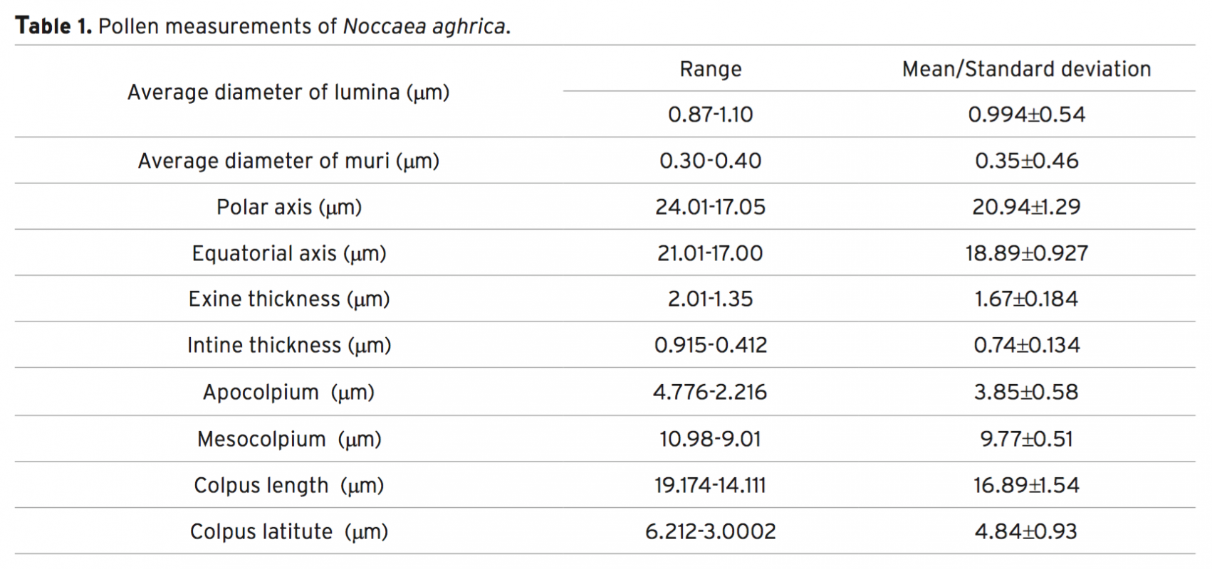 Araştırmamıza konu olan Noccaea aghrica Fırat & Özüdoğru türü ülkemizde endemik tehlike altında bir tür olup yalnızca üç lokalitede bilinmektedir. N. aghrica polenleri genellikle prolat, izopolar, trizonokolpat, retikülat yapıda olup, kolpus neredeyse kutba kadar uzanır. Polenlerin ortalama boy ve eni sırasıyla 16.89 μm ve 6.21 μm; ortalama polar ve ekvatoral eksen boyu ise 20,94 μm ve 18,89 μm olarak ölçülmüştür. Polen ölçüm sonuçları, elektron mikroskobu ve ışık mikroskobu fotoğrafları da çalışmamızda yer almaktadır.